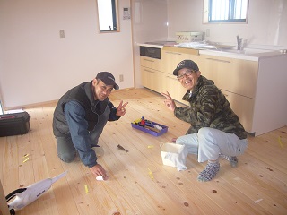 JUGEMテーマ:注文住宅 こんにちは由美です。 今日は朝一番から行橋市今井のM様邸に出動です。 陣内課長は行橋市F様邸の上棟準備で大忙しなので 今日は GREENWOOD CARPENTERS +1のトリオで エイ! エイ! オ〜っ がんばりました。 まずは無垢板が ささくれたり割れたり反ったりしていないか 補修などを行いまして それから 蜜蝋ワックスで磨きあげ。 う〜ん 潤い...