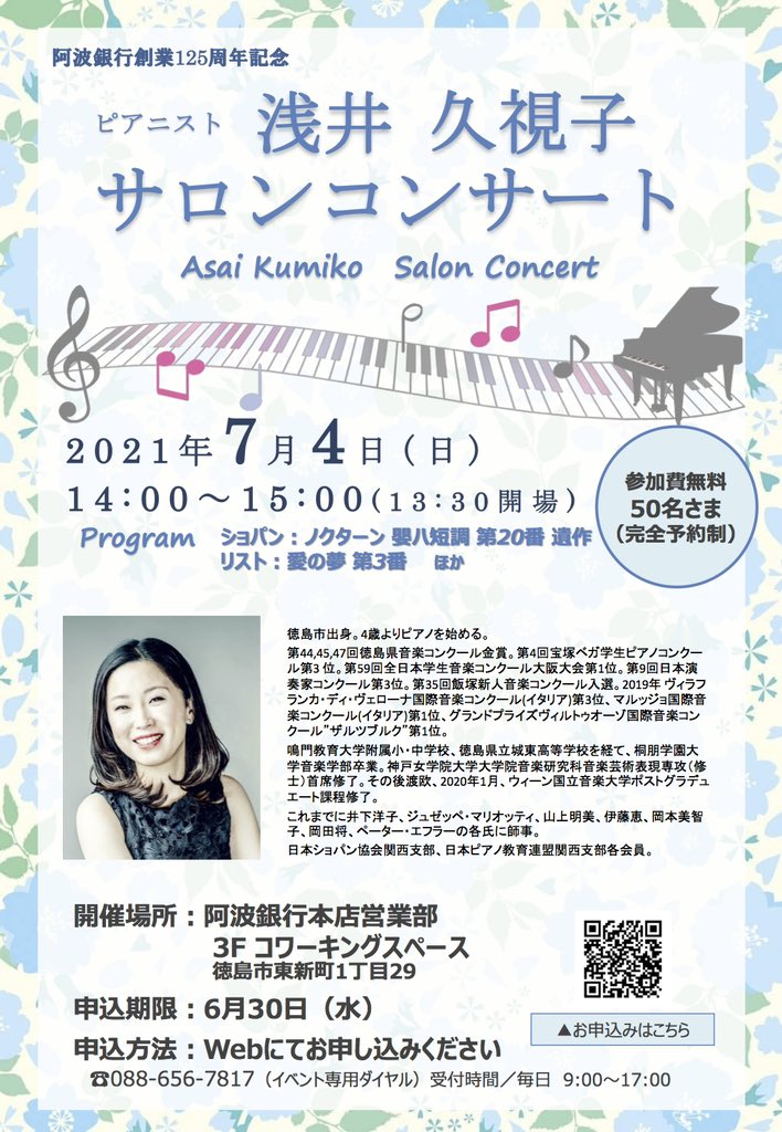 ※お陰様で満席になりました。 ピアニストの浅井久視子さんが阿波銀行本店営業部で リサイタルを開催します。 【日時】 7月4日(日曜日) 14時開演 四つ葉のクローバー会場一面に広がる窓からは眉山も望め 素敵な空間の中、演奏をお楽しみ下さい♪ 入場無料 ※50席限定 / 完全予約制 【プログラム】 ハイドン ピアノ・ソナタ ハ長調 Hob.XVI:50 シューマン アラベスク Op.18 ショパン ノクターン第20番 遺作 12の練習曲 Op.10-12「革命」 バラード第4番 Op.52 ド...