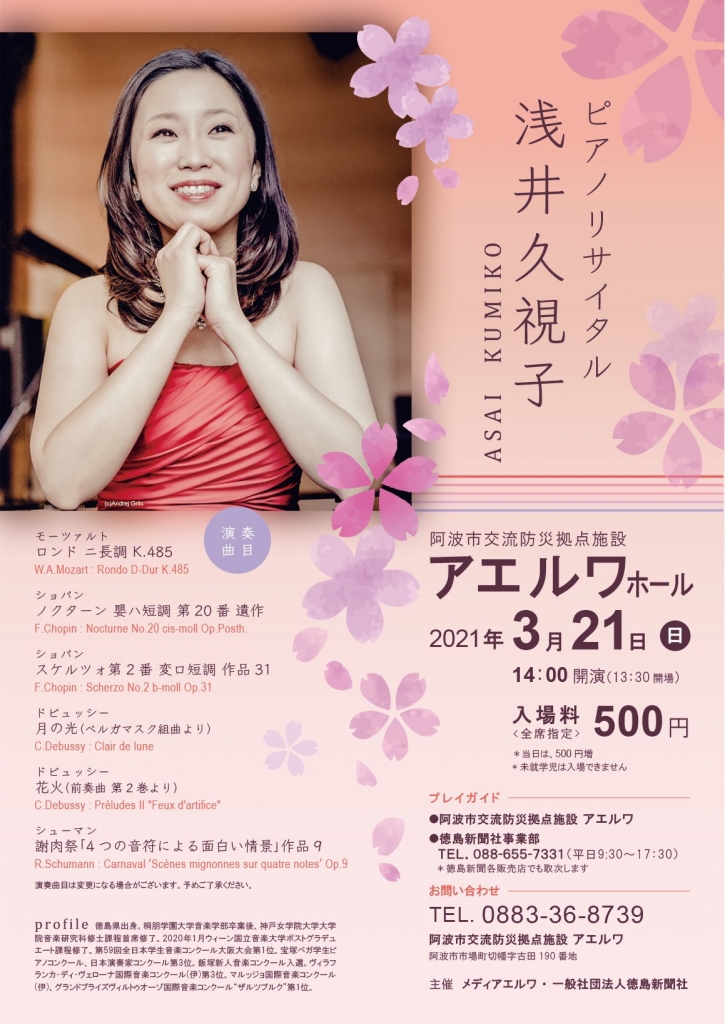 浅井視美子さんが 21日にピアノリサイタルを開催します。 アエルワホールにて開催。 【徳島文理大学を合格された保護者の方は必見!!】 石部宅建では 徳島文理大学の新入生を 対象に 入居予約(申込み)を受付中 気に入った お部屋があれば、最長で国立の後期発表までご予約可能♪ ※ご予約には申込書のご記入が必要になります。 しかも、石部宅建では、お申込時に【手付金】【預り金】【証...