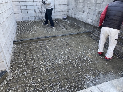 今日は、先日お引渡しさせていただいた 神戸市の駐車場リフォーム現場のご紹介です。 元々は枕木敷きでした。 左の写真は、枕木を撤去している途中の写真、 右の写真は、撤去後の写真です。 伸縮目地(写真真ん中)を入れ、ワイヤーメッシュを敷いたところです。 コンクリートを打設し、色粉をふっているところです。 型押しをしている写真がなかったので、いきなり模様ができました(笑) カラーリリースオイルを塗布しています。(2次...
