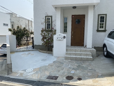 先日に引き続き、駐車場の拡大リフォームをした西宮市の現場の ご紹介です。 新しい駐車スペースです。 新しく石を貼った部分も、既存の石貼りアプローチに馴染んでいます。 新しい門柱です。 表札・ポスト・インターホン飾りなどは、もちろん再利用です。 花の模様に作った石貼りのアクセントもかわいいですね。 全景です。 車2台分のスペースが出来上がりました。