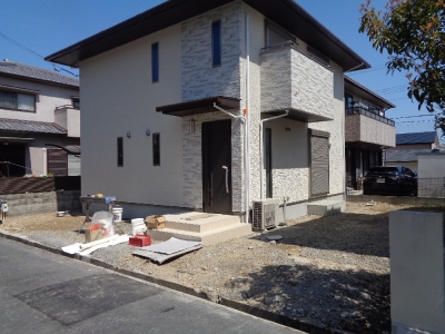 先日の続きで、神戸市のオープン外構の完成写真のご紹介です。 門壁の吹付も終わりました。 シンボルツリーはシマトネリコです。 夜になるとスポットライトでライトアップされます。 正面から見るとこんな感じです。 天然石と植栽で、ナチュラルなイメージです。 お客様用の駐車場と建物の間は植栽スペースになっています。 駐車場の目地は白の玉石です。