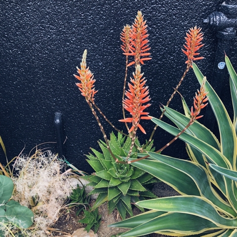 アガベの奥に隠れつつあるアロエノビリスですが、開花時期が近付くと、アガベの隙間からどんどん蕾が伸びてきます。