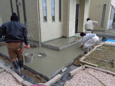 先日の続きで、西宮市のガーデンリフォームのご紹介です。 テラスの下地が出来てきました。 こちら側もワイヤーメッシュを敷いて、コンクリートを流し込んでいっています。 かなり広々としたテラスです。 建物に向かって左側の下地、完成です。 タイルは玄関ポーチと同じ物を貼り、仕上がり高さも同じになる予定です。 建物に向かって右側の下地も完成です。 掃き出し窓の前に積まれたブロックは、何でしょうか? 正解は、リクシルさんのココマ?L...