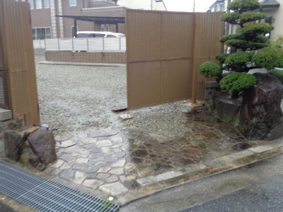 先日からご紹介していた外構リフォームの現場、 完成写真をまた撮ってきましたので、もう1度ご紹介します。 駐車場入り口です。 扉が閉まっている写真を撮ってきました。 四国化成の商品です。 こちらは勝手口。 同じく四国化成のクレディ6型です。 フェンスは四国化成のバリューフェンス6型です。 すき間カバーも付けていますので、ブロックとフェンスの間の すき間がありませんね。 これで、この現場のご紹介は終わりです。 次回は、同じく...