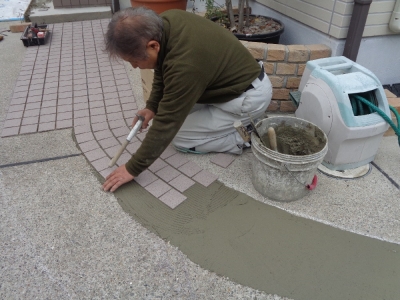 1月はブログ更新が滞ってます。すみません。 久しぶりの更新です。 今日は、12月27日の西宮市外構リフォームの続きです。 ブロック積の上からモルタルで下地をしたところです。 駐車場側から見るとこんな感じです。 オーバードア(跳ね上げ門扉)も取り付けられ、アルミ鋳物門扉も 取り付けられました。 レンガ積花壇も出来ましたね。 次はアプローチを作っていきます。 元々は全部コンクリートだったのですが、アプローチ部分だけタイルを 貼っていきます。...