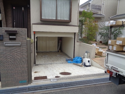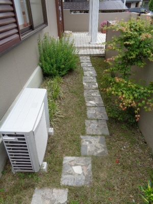 一昨日ご紹介した駐車場リフォームの方の庭リフォームを 今日はご紹介です。 6月7日・8日・22日・7月18日の総集編です。 まずは通路部分のビフォー写真です。 飛び石になっていますが、その周りに雑草が生えて困るとのことでした。 緑の部分を少し残して、あとは石貼にしました。 庭部分のビフォー写真です。 部分的に植栽スペースを残して、それ以外はタイル貼りのテラスと 樹脂デッキにしました。 タイルを建物に対して45°で貼...