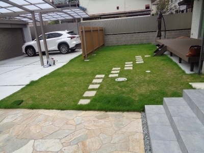 今日は、天然芝から人工芝にリフォームした現場のご紹介です。 ビフォー写真です。 天然芝の状態ですね。 左隅にある四角いものが人工芝のサンプルです。 芝をはがしていきます。 どんどん、はがしていっています。 整地が終わりました。 この後、人工芝を張っていきます。 完成写真はまた後日ご紹介させていただきます。