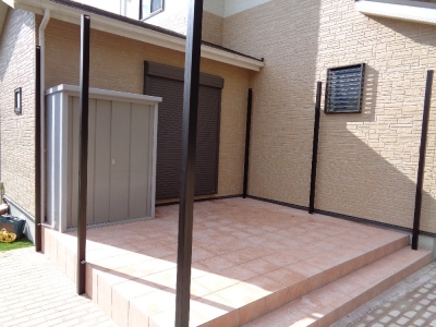 一昨日の続きで、今日は完工編です。 タイル貼りテラスの完成です。 既存の物置もこちらに移設しました。 6本立っている角柱はオーニング(日除け)を設置するためです。 夏になれば、オーニングをつけて、子供たちがビニールプールで 水遊びを楽しめそうですね。 タイル貼りテラス以外の部分にはインターロッキングを敷きました。 雑草に困らせることもなく、バーベキューを楽しめる素敵なお庭に 変身です。 通路部分もインターロッキングを敷きました。 生...