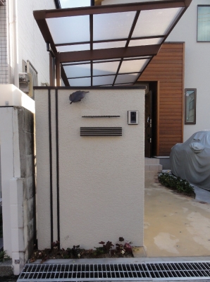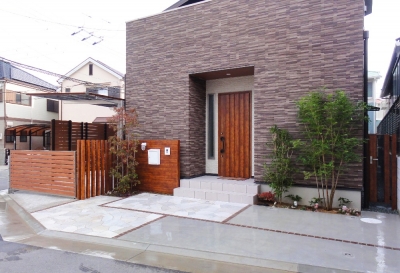今日は、完成写真を載せていなかった物件のご紹介です。 8月7日のブログで、ご紹介させていただいていて、 「完成は後日」…と書きつつ、アップしていませんでした。 もう7ヶ月近く経ってしまっていますね(苦笑) 門柱の完成写真です。 照明・ポスト・表札・笠木・縦ライン全てディーズガーデンの商品です。 アプローチは、アンティークレンガで縁取り、 カラーコンクリートにガラスを埋め込んでいます。 植栽スペースにはヤブコウジを植えました。