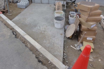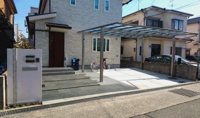 今日は、箕面市のオープン外構のご紹介です。 まずは、着工前です。 アプローチ部分の下地コンクリートが出来ました。 400角の石を敷いていきます。 ニッタイのピュアストーン ダスキーグリーンです。 駐車スペースはコンクリート金コテ押えです。 上の写真はカーポートの柱だけ施工した状態です。 左のブロックは門柱です。 今、2段だけ積んだ状態ですね。 ブロックを積み終わって、下地のモルタルを塗っています。 仕上がり...