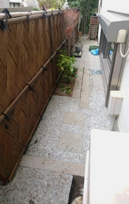 今日は、1月13日にご紹介させていただいた芦屋市の ガーデンリフォームの完工編です。 左の写真は和室前、右の写真は通路です。 両方、板石を残してその周りをタカショーのネットストーンで洗い出しにし、 植栽を整理しました。 次はアプローチです。ビフォー写真です。 プリペットがアプローチのほうまで枝を伸ばしていました。 プリペットを撤去、必要な植栽を残し芝は撤去しました。 フェンスを木調の目隠しのものに替えて、 塀を吹付けし...