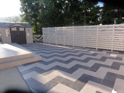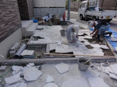 今日は、宝塚市で施工中の現場のご紹介です。 アプローチに白の自然石を貼っています。 ピンコロのラインを入れてデザインしています。 ピンコロはユニソンのクレモナピース リードブラウンです。 カーポートを取り付けています。 完成したら、またご紹介しますね。