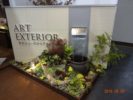 関西エクステリアフェア タカショーさんのブースです。 毎回、植栽アレンジにも力を入れておられます。 インドアガーデンにも人気のセダムを使った演出ですね。 ライティングや水の演出にも強いタカショーさんならではの演出です。 他メーカーとは一線を画する8?強化ガラス張りのガーデンルーム、 「オールグラスポーチ」。引き戸か折戸で開き、閉じると一枚ガラス のようにクリアな外観です。 海外の建築雑誌に登場しそうな意匠です。扉はずっしり重さを感じながらも...