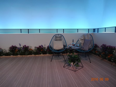 三協アルミさんのブース。いつも特大スケールの展示で楽しませてくださいます。 今回は、驚きの新商品が二つありました。 ひとつは、人工ウッドデッキの既成概念をくつがえした「ラステラ」。 床板サイズが従来よりも130?幅が広い274?。 カラー展開も従来のウッドカラーはなく、モダンなグレイッシュカラー。 特徴は側面を立体的にして、浮遊感を出したところ。 縁側の延長スタイルだったウッドデッキの概念を変えて、「屋外フローリング」として 単独で庭に設置するとリゾートスタイルとして発展しそうです...