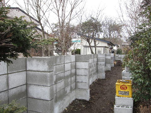 今日は朝から暖かい一日でしたが、 午後は天気が不安定で雨も降りました。 ブロックを搬入します。 現場が広いので作業がしやすいです。 丁張りをかけてレベルで高さを確認してからブロックを積んでいきます。 縦筋はD13(四部筋)を使用しています。 北側の既存コンクリート基礎のブロック積みから始めました。 今日は2段目までブロックを積みました。 JUGEMテーマ:エクステリアガーデン 168