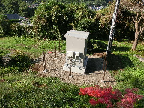 今日も昨日に引き続き栃木県那珂川町のB高校の現場で、 キュービクル式高圧受電設備の周囲にフェンスを施工します。 今日はここ状態から作業を開始します。 各コーナー柱にコーナー用の金具を取り付けます。 柱にフェンスを専用の金具で取り付けます。 上部に連結用金具を取り付けます。 フェンスの間隔を測り不要な部分を切断します。 フェンスの切断面が錆びないように特殊な液体で保護します。 フェンスの取り付けが終わって門扉の取り付け作業を行います。 門柱と門扉を固定する丁番を取り付けています。 施...