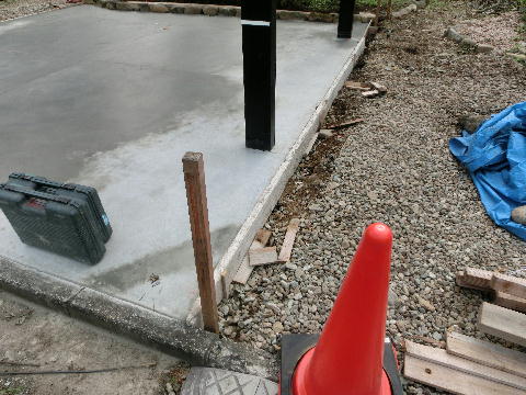 今日は西側の車2台分の駐車場をコンクリートにする為に生コンを3人で打設します。 ワイヤーメッシュを敷き詰めます。 コンクリートミキサー車が到着しました。 これから生コンクリートを流していきます。 ワイヤーメッシュのかぶり厚さを確認しながら打設していきます。 コンクリートミキサー車が近くまで入れないので、 生コンシューターを使って奥のほうから生コンを打設します。 アルミ製の板トンボでならし作業、荒仕上げ、アマ出し作業をします。 生コンクリートの打設が完了しました。 暫く放置したあと...