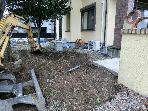 今日は那須塩原市W様邸の工事です。 朝から雨が降りそうな天気でしたが、雨が降ってきた16時まで仕事をしました。 植栽されていた植木を移動した後に水栓柱を移動する為に地面を掘削をします。 掘削と共に、正面の金木犀(きんもくせい)が大きくなり家の方まで伸びていたので剪定しました。 水栓柱を移動する為に掘削をします。 コマツのショベルカー(PC27MR)で慎重に水道管を探します。 水栓柱付近は水道管が破損する恐れがある為にスコップで掘ります。 水栓柱を移動する位置まで掘り進めて行きます。 既存...