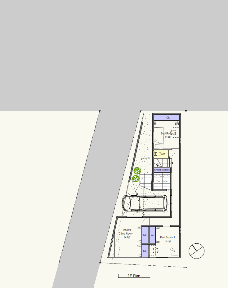 【ボツストックス】#2 ※ご縁なく建築に至らなかった、でも丹精込めた図面をアップします。 間取り図、立面図、模型写真、何を考えたのか等書いていきます。 収納は紫色、水回りを黄色で着色しております。 ・・・・・・・・・・・・・・・・・・・・・・・・・・ 今回の敷地は市街地です。北側と西側が道路に面している角地です。 土地形状は平行がないいびつな形で面積は31坪程。 北側は大きな幹線道路に面しており、交通量も多いです。 西側は車一台が通るほどの道路です。 ...