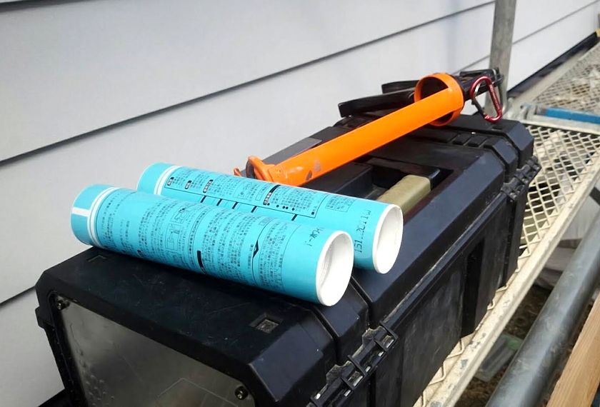 コーキングが始まるようです。 コーキングというのは、隙間をボンドみたいな白いやつでうまいこと塞いでいいかんじに仕上げるやつの事です(程度の認識しか無い)。しかし、ラップサイディングを生かすも殺すもこのコーキング技術にかかっています。重要です。 コーキングで使う何か きちんとマスキングしてあります スネークに「これはコーキング剤か何かか?」と問うと「たぶんそう」と言うのでたぶんそうだ...
