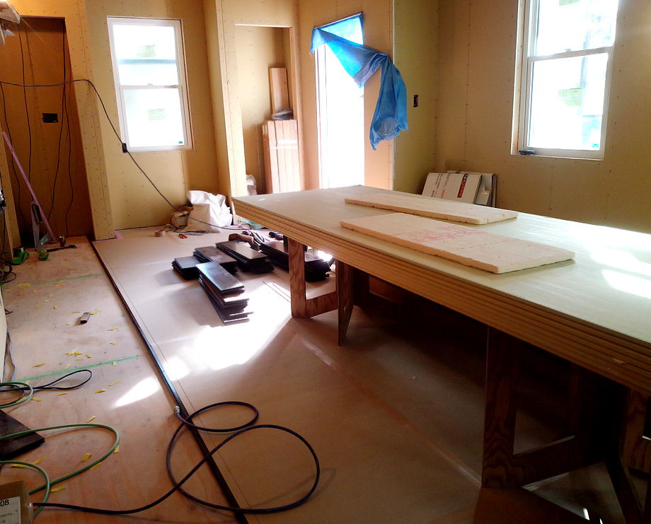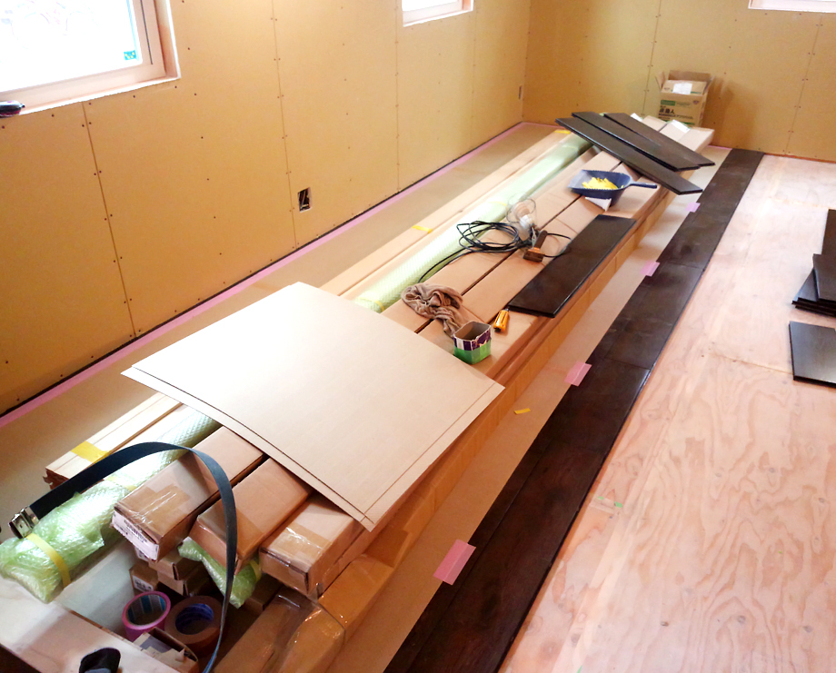 フローリングが、リビング半分と玄関前辺りまで終わっていました。 右の養生がしてある部分までフローリング済み 3〜4サイズある板を、部屋に合わせてカットするそうです。当然ですが私には無理です。まず計算する時点でもう… 玄関前。下駄箱?今はなんて言うんだ?靴箱?シューズクローク?がくる柱部分も綺麗にカットされているのでしょうかこれは?よく見えんのでどういう感じになっているか分かりませんが、すっ...