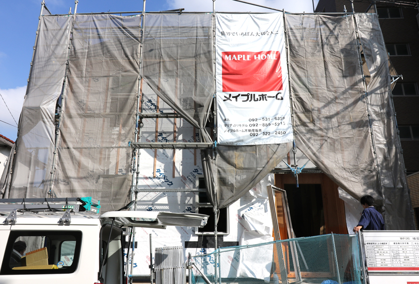 いよいよごちゃってきました。 何もかもが同時進行で、色々な業種の方が出入りしています。玄関前に立っているのは旦那です。ご覧の通りブルーカラーです。職人っていいですよね! 玄関ドア枠 色々進んでる タイベックシートの下にある黒いやつですが、打ち合わせの最後あたりに「ここ何色にしますか?」とMさんに訊かれて迷わず「黒!」と言ったアレです。この部分は、家が仕上がった時に良さを...