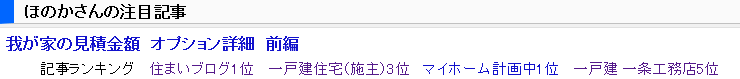 JUGEMテーマ:夢のマイホーム計画 こんにちは、ほのかです。 前々回の記事に注目していただいたようで 一瞬ですが(笑)、《我が家の見積り金額 オプション詳細 前編》がいい成績でしたので喜びの記事♪ なぜか二重投稿になって、削除したのが反映されていないほうの記事が上に来てしまったので ご迷惑をおかけしています、すみません。 もうだいぶ下の方に下がっているので大丈夫かと思いますが・・・。 参考になるかどうか分からないのですが、がんばって見積書から拾ったので まだお読みでない方は、よろしかったら...