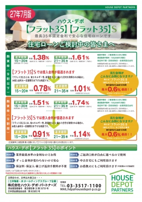 JUGEMテーマ:夢のマイホーム計画 「住まいと家計のコンシェルジュ」スタイルワンコンサルティング代表、 【家づくりエージェント】の阿部でございます。 さて今日は、フラット35、2015年7月度実行金利のお知らせ。 〜金利は上昇傾向に!〜 ○【フラット35】7月金利 ≪融資率9割以下≫ ・15〜20年:1.38%(前月比+0.07%) ・21〜35年:1.61%(前月比+0.07%) ≪融資率9割超≫ ・15〜20年:1.51%(前月比+0.07%) ・21〜35年:1.74%(前月比+0.07%) 金利の基準となる長期金利の上昇を受けて、 2...