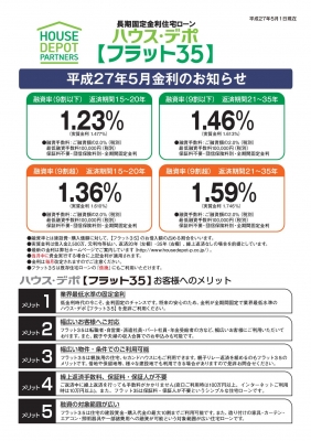 JUGEMテーマ:夢のマイホーム計画 「住まいと家計のコンシェルジュ」スタイルワンコンサルティング代表、 【家づくりエージェント】の阿部でございます。 さて今日はフラット35の金利情報についてのお話。 金利は若干の引き下げになってますね。 ○ハウス・デポ【フラット35】5月金利 ≪融資率9割以下≫ ・15〜20年:1.23%(前月比△0.08%) ・21〜35年:1.46%(前月比△0.08%) ≪融資率9割超≫ ・15〜20年:1.36%(前月比△0.08%) ・21〜35年:1.59%(前月比...