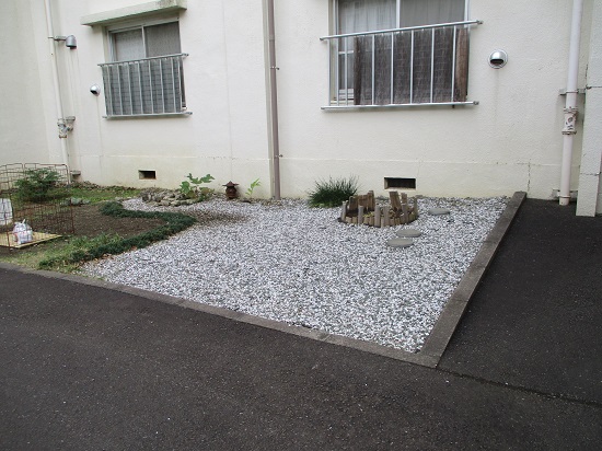 あれから気になって「枯山水」を見に行くと… ありゃ? 前回植えてあったのが刈り取られてる… 何か別の物を植えるのかな… ちなみに前回はこうでした… 鉄灯篭は健在。 この灯篭もどこで手に入れたのか、なかなか味があるねぇぇ…。 よく見ると… カエルの置物もありました… それにしても、よくやるな〜 ( ̄▽ ̄;) で… 今日気づいたのだが… なんと! 隣の階段は洋風庭園風に...
