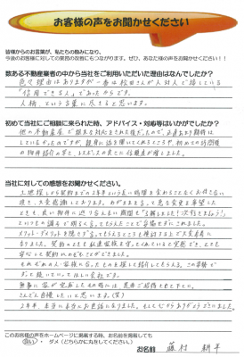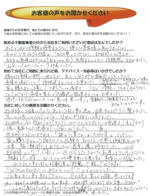 す、す、す、すばらしい(笑)お客様アンケートいただきました。 Q 数ある不動産業者の中から当社をご利用いただいた理由はなんでしたか? A ネットでたくさんの情報を検索するうちに様々な業者様と関わりましたが、ホームページやブログの内容が「お仕事」だけではなく、松田様のお考えや生き方を表現されたものであることを知り、共感するとともに信頼感が生まれました。”お会いしてみたいな”という印象でした。 Q 初めて当社にご相談に来られた時、アドバイス・対応等はいかがでしたか? A 穏やかな笑顔...