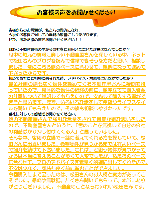 やはりこれがうれしいですね、アンケート。 今回のお取引でも褒められました(笑)。 やはり、お客様に対して末永くお付き合いをさせていただく前提でお仕事をさせていただいているので、喜んでいただけるんだろうなって思っています。やっぱり心がないといけません。 今度、このお客様とは飲みに行こうという計画がありますが、お互いお仕事の様子を見ながら行こうかと思っております。 実は、フェイスブックではすでにお友達(笑)。リアルにお友達になりたいと思っています(笑)。 目標は中河原駅界隈。 うちからもそんな...