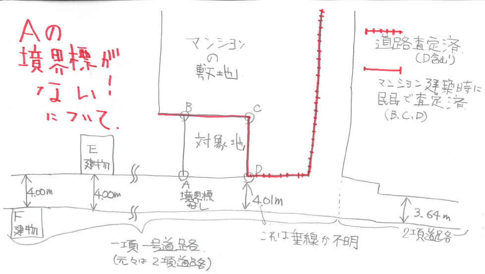 は〜い、こんな芸術的な図を書いてみました。 ある意味、ピカソに勝ったかもw この物件の前面道路(D点のところ)は、道路台帳によると、幅員4.01m。 ここの道路は、以前42条2項道路(もともと4mないけど、道路として認定されている道路のこと。建て替えする時はセットバックしてねという約束をしている。) B,C,D点は境界標があり、隣接地のマンションを建築している際に境界立会書を作成しているらしいので問題ないと考えられますが対象地の所有者様がそれを紛失しているようで、かつ記憶がほとんどないらしい。とい...