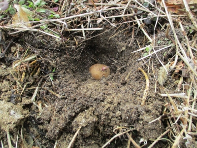 今日はジャガイモも植え付け。 自然農は耕さないので、穴を掘って種イモを置くだけ。 種イモは去年収穫したもので、小さかったものをそのまま植えつけます。 この品種は「キタアカリ」 この辺りで人気で親しまれているものです。 通常のジャガイモの栽培はイモが大きくなり始めたら 土寄せをして表面に顔を出さないようにします。 緑になるから。 今年は通常の植え方と、土寄せしない深植えを両方やってみました。 昔徳島で深植えでもよくできたので試してみます。