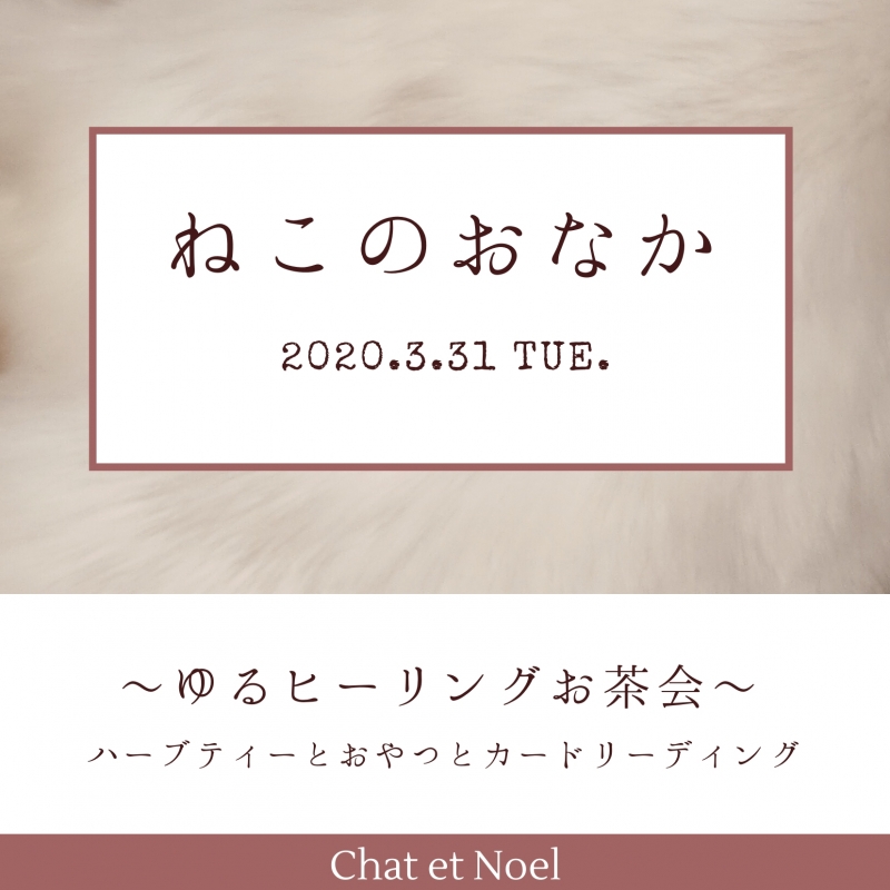 ねこのおなか #6 〜ゆるヒーリングお茶会〜 日時 3/31(火) 1もふ目 10:00〜 2もふ目 11:15〜 3もふ目 13:15〜 4もふ目 14:30〜 5もふ目 15:45〜 6もふ目 17:00〜 参加費 1もふにつきおひとり様 1500円 / 3000円 "今のあなたに必要なメッセージ"の1枚引き→1500円(税抜) 具体的なお悩みや質問があるなど詳しいリーディング→3000円(税抜) 内容 オラクルカードリーディング お好みまたはお悩...