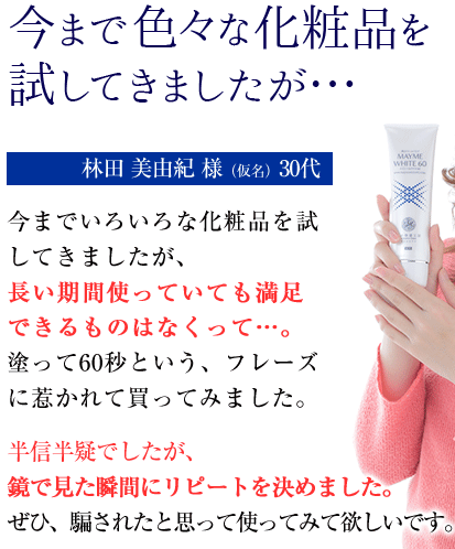 JUGEMテーマ:快適な生活   次世代型の美白パックが気になり記事を書きました。   今日書いた記事  次世代型美白パック【メイミ―ホワイト60】   それは、今までにない新しいタイプのクリーミィタイプのパック【メイミ―ホワイト60】という商品です。   しかも、塗って60秒後に洗い流すと理想的な美白効果があるという優れものらしいですね。   有名女性誌にも掲載されて、モンドセレクションで銀賞を受賞しています。   顔以外の首やデコルテにも、60秒...