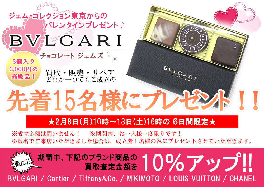 こんにちは♪*+. ジェム・コレクション楽天市場店 ジェム・コレクション東京ヤフオク店 ダイヤモンド・宝石・貴金属・ブランド品の買取&販売&リペア専門店 ジェム・コレクション東京 スタッフのコザカイです♪(^0^) 今日はさくっと、ジェム・コレクション東京での バレンタイン特別企画 のご紹介をさせてください! ★バレンタイン特別企画★ ジェム・コレクション東京で、買取・販売・リペア、どれか一つでもご成立のお客様、 先着15名様に 【ブルガリ・チョコレート・ジェ...