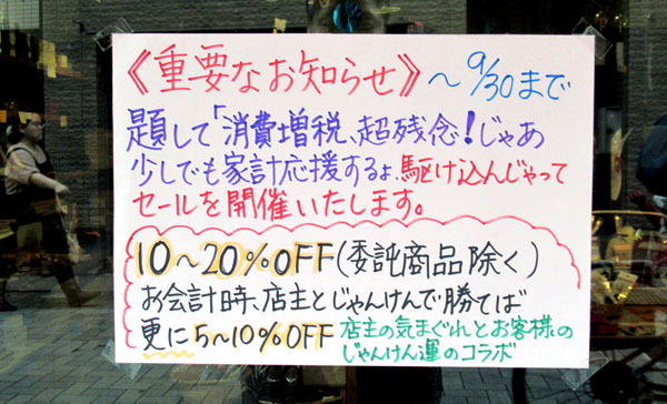 JUGEMテーマ:幸福に生きる JUGEMテーマ:和雑貨 JUGEMテーマ:地元のお店・ショップ・商店街 JUGEMテーマ:インテリア小物・雑貨 【お知らせ】9/30まで消費増税前の駆け込みセール開催 ものによって10〜20%OFF(委託商品除く)会計時に店主とじゃんけんで勝った方は+5〜10%割引します→つまり、店主の気まぐれとあなたのじゃんけん運次第 棕櫚たわし、タオル、石鹸や歯ブラシ、お香、手ぬぐい、ふきん等、生活消耗品は駆け込んで間違いなし(うふふふふ ...