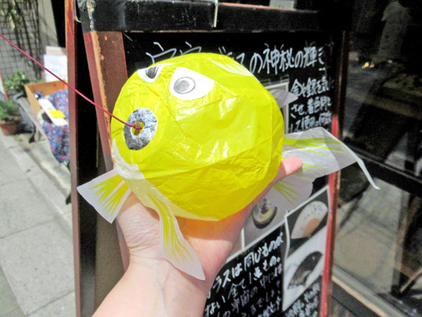 JUGEMテーマ:幸福に生きる JUGEMテーマ:和雑貨 JUGEMテーマ:地元のお店・ショップ・商店街 JUGEMテーマ:インテリア小物・雑貨 営業しております。 今日は、A看板に下げていた紙風船がシワシワになったので、今度は「黄色い金魚」に交換。 前の紙風船は、空気穴が頭のてっぺんについていたのに、金魚は口のところが空気穴。 すぼめた口元、愛らしいと思えないこともない‥ 吊り下げると、釣り上げられた魚状態で、これはイメージア...