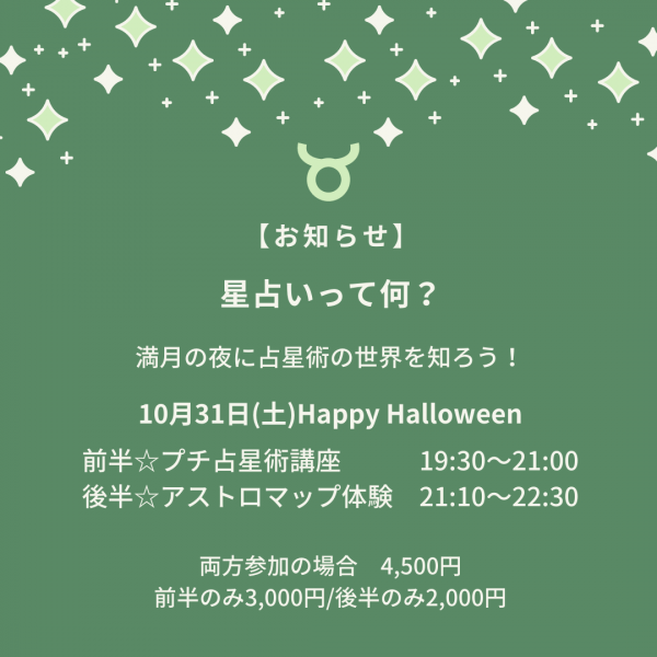 皆様、こんばんは! もうすぐ今月2回目の満月★ 【緊急開催】 星占いって何? 満月の夜に占星術の世界を知ろう! 10/31土曜日 HappyHalloween 前半☆プチ占星術講座 ・月の満ち欠け・星座の成長・惑星の特徴 ・グレートクンジャンクションって何? ・風の時代って何やろ?・ハウスについて ・新月満月からうける影響の詠みとり方法など 後半☆アストロマップ体験 生年月日・出生地・出生時間からつくる 自分だけのパワースポット世界地図 ...