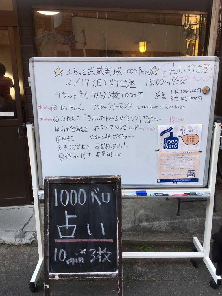 みねんこです。 2/17日曜、占い席に座って待っています。 場所は武蔵新城、灯台屋 みねんこの待機時間は、13〜18時 「星占いでわかるタイミング」20分から(10分延長もOK) もし事前連絡あればお時間予約も承ります。 1000円でべろべろになれるメニューを商店街の各店が提供しているこのイベント、2/17〜2/21までかな。http://shinjo1000bero.com/ 灯台屋さんは飲食店ではないんですが、1000円で3枚つづりのチケットを販売、一枚が10分のサービスに。 日替わりでいろいろな占いやセッ...