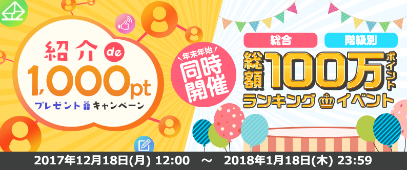 JUGEMテーマ:お得な情報大公開中 毎日、寒いですね(;´Д`) 風邪などに注意して過ごしてくださいね♡ ポイントサイトの方は 今年最後のお友達紹介キャンペーンで熱くなってます。 先日は「モッピー」をご紹介しましたが 1000円貰えるキャンペーン? ハピタスでもキャンペーンが始まりました♪ 期間限定!キャンペーンにエントリーして紹介すると 紹介した人も、された人も1,000ポイントプレゼント! さらに!同時開催の ランキングイベン...