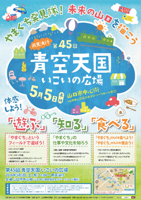 「第45回青空天国いこいの広場」 日時:5月5日(土・祝)11:00〜16:00 会場:山口中心街(山口中心商店街およびパークロード周辺) 毎年、こどもの日の恒例イベント青天も今年で第45を迎えました! 今年のテーマは「やまぐち発見隊!未来の山口を描こう」 「遊ぶ」「知る」「食べる」という3つのキーワードでやまぐちを体感! ●商店街アーケードを横断するミニ電車登場! ●今話題の綱渡りスポーツ「スラックライン体験」 ●BMX、スケートボード体験&スペシャルショー ●はたらく車展示 ●ぶち...