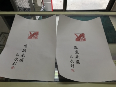 JUGEMテーマ:印章 裏の公民館である文化祭に展示する「密刻」になるのかな〜 とりあえず5.5cm角の印材に「鳳凰来儀」ということで彫って作品として 半紙に捺しました。 この印材は以前に薩摩柘植を取り寄せて 5.5cm角に加工しました。 以前に彫った「鳳凰来儀」は枠も装飾入りの細かい 内容だったんですがまだ少し実力不足みたいなので 枠は通常通りの真っ直ぐの線にしています。 そして装飾がない分「鳳凰」を 大きく配置しました。 とりあえず裏打ち...