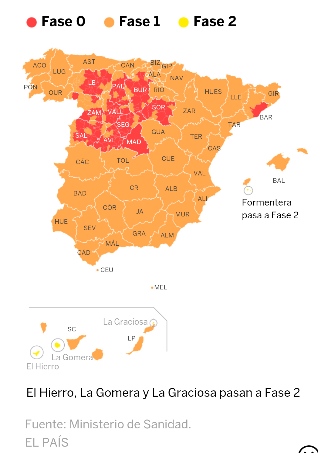 JUGEMテーマ:海外生活 今日5月18日から、カナリアス諸島のうちラ・ゴメラ島とエル・イエロ島はFase2(2段階目・2フェーズ)へ入りました。 (画像新聞El Paisより) バルセロナ市とその周辺都市。 マドリッド。 マドリッド周辺のカスティーリャ・イ・レオン州などは、Fase0のまま。 それ以外はFase1に入りました。 バルセロナはまだなのでFase1の法令はまだ読んでいません。(笑) 最近の状況は ・1日あたりの死者...
