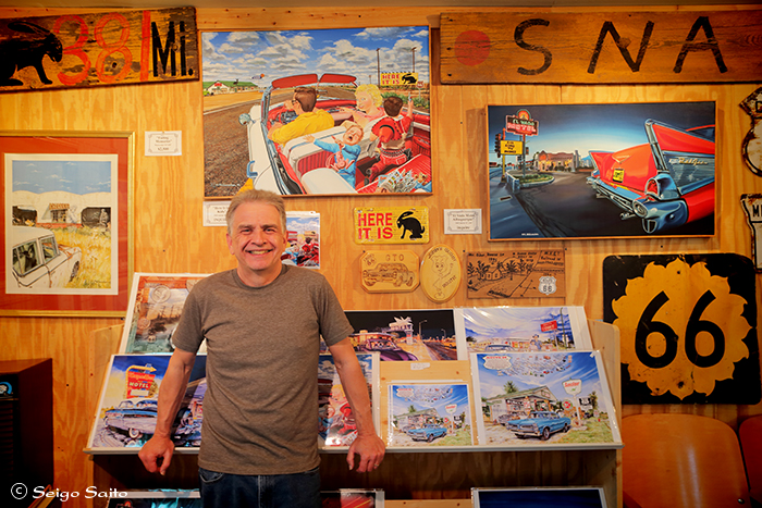 jerry mcclanahan @mcjerry's route 66 gallery, chandler, oklahoma 2018 Canon EOS 1DX / Canon F 24mm 1.4L II 今日のこの人に会いに行ったので ジェリー・マクラナハンさんの写真 オクラホマ在住のアーティストです 自分がルート66を走る際に使うガイドブック EZ 66 Guideの著者でいい感じの絵を沢山描いています ルート66走る方は必須ですよ〜 読めなくても絵が書いてあるので使えます! たくさんの素敵な画を生で見れてよかった 遊びに行った...