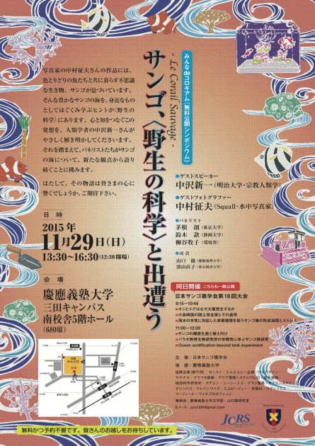 日本サンゴ礁学会開催中に、下記の一般公開シンポジウムが開催されます。 入場無料&予約不要です。 http://sauvage.jp/archives/3254 第18回日本サンゴ礁学会 一般公開シンポジウム「サンゴ、<野生の科学>と出遭う」 会場に展示される中村征夫さん (水中フォトグラファー)の作品には、 色とりどりの魚たちと共に暮らす不思議な生き物、サンゴが息づいています。 そんな豊かなサンゴの海を、身近なものとしてはぐくみ学ぶヒントが〈野生の科学〉にはあります。 心と知をつなぐこの発想を、人類学者の中沢...