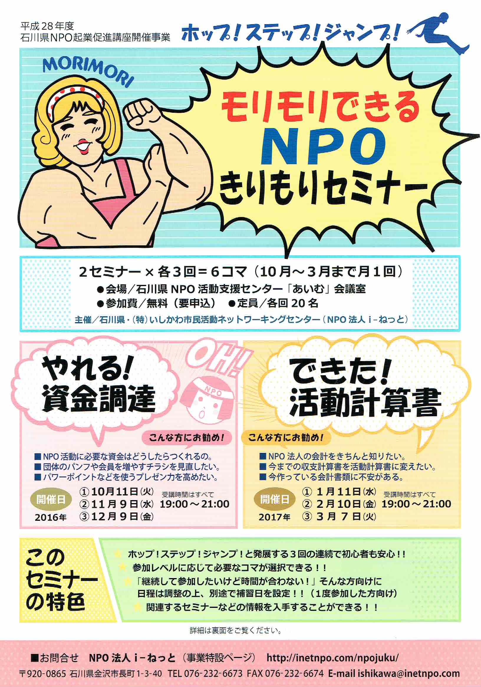 JUGEMテーマ:NPO・NGO 平成28年度 石川県NPO起業促進講座開催事業 ホップ!ステップ!ジャンプ! モリモリできるNPOきりもりセミナー ホップ!ステップ!ジャンプ!と発展する3回の連続で初心者も安心!! 参加レベルに応じて必要なコマが選択できる!! 「継続して参加したいけど時間が合わない!」そんな方向けに日程は調整の上、別途で補修日を設定!! (1度参加した方向け) 関連するセミナーなどの情報を入手することができる!! 『やれる!資金調達』 ...