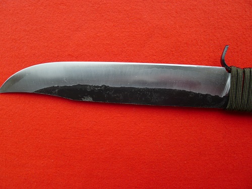 安来青鋼使用、手打ちの狩猟刀、鋼ですので錆びますが切れます。猪のトドメ用にいかがでしょう。全長約30.5cm、刃渡り約18.5cm 本革サック入り。 価格¥17.200(税込み)